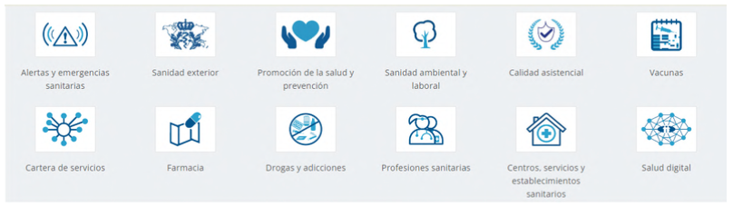2 | Áreas. Se ofrece a los ciudadanos información pública de reglamentos, estrategias y planes de salud y, a los profesionales de la salud, documentación referida a su profesión. Por ejemplo: Registros de información sanitaria, Decálogo de protección de datos para el personal sanitario y administrativo y, el acceso a la Revista Española de Salud Pública (Internet).