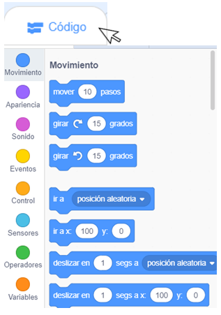 Las acciones del gato se seleccionarán de entre el grupo de instrucciones de Código que tiene Scratch.