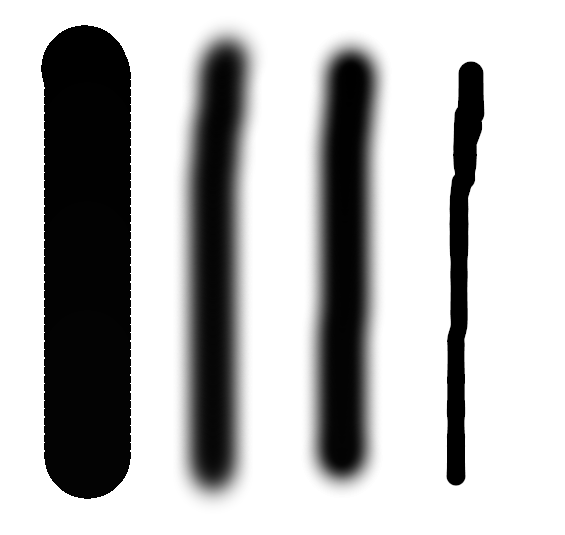 - Proporción de aspecto: controla la relación entre el ancho y la altura del pincel. Un valor de 1 significa que el pincel es cuadrado, mientras que un valor mayor significa que el pincel es más alto que ancho, y un valor menor significa que el pincel es más ancho que alto. En la siguiente imagen tenemos un trazo sobre la superficie con proporción de aspecto 1, +20 y -20 de izquierda a derecha.