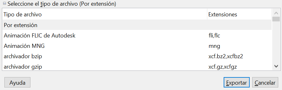 3 | En la ventana de “Exportar como”, seleccione el formato de imagen deseado del desplegable “Seleccione el tipo de archivo (por extensión)” como se ve en la figura de abajo. Los formatos populares incluyen JPEG, PNG, GIF y BMP. Sin embargo, el programa ofrece otras múltiples opciones como: