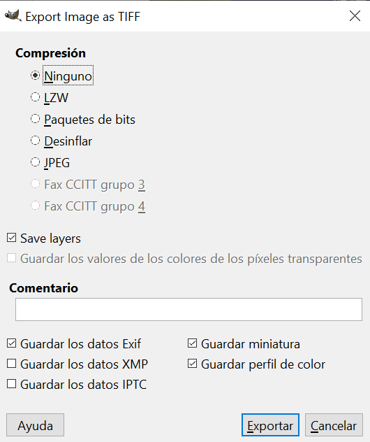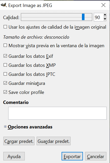 A continuación, se describen los pasos que se deben seguir en GIMP, software libre para la edición de imágenes, para guardar los diseños con distintos niveles de compresión.