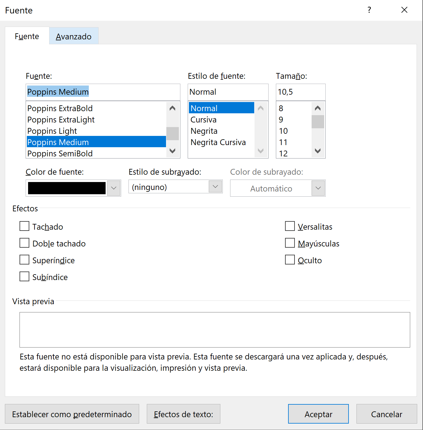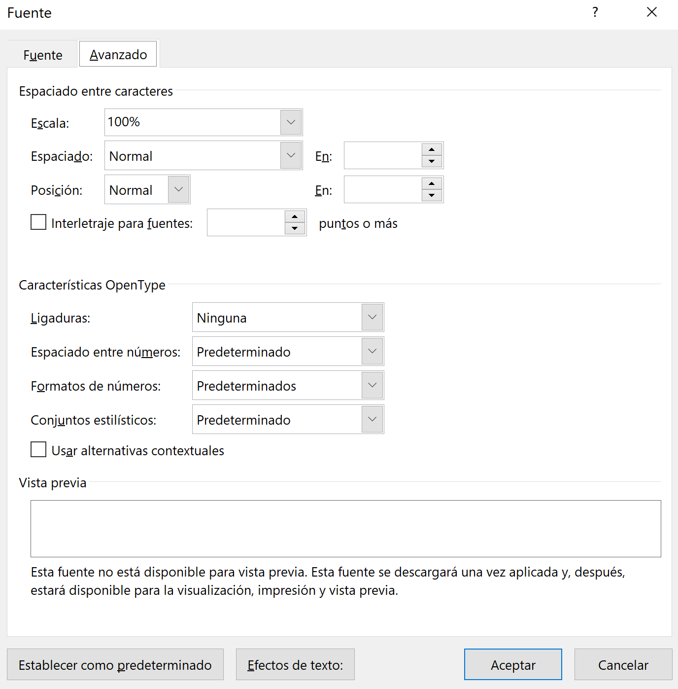 Si utilizamos cualquier programa de procesamiento de texto veremos una pestaña relativa a las fuentes. En el caso de Word, bajo el panel de Inicio, encontramos esta pestaña con las características principales relativas a tipografía. Además en la sección de “Avanzado” podemos completar la modificación de la tipografía.
