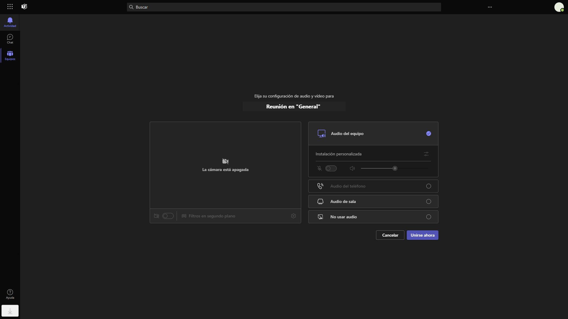 En la figura 1, se puede observar un ejemplo de la pantalla anterior al inicio de una videoconferencia en Microsoft Teams: