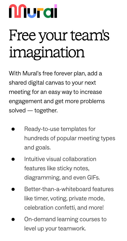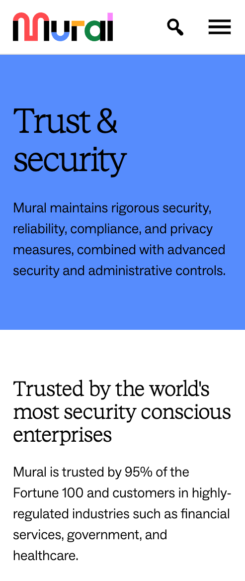 - Cumplimiento de normas de seguridad: Mural cumple con las normas de seguridad de la industria, como GDPR, SOC 2, ISO 27001 y HIPAA, para garantizar la seguridad y privacidad de los datos de los usuarios.